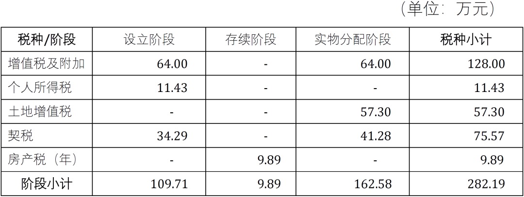 王先生以别墅设立家族信托的整个过程中,涉及两次交易,经过简略计算,将会产生合计280余万元的税费。该案例中涉及的税费详见下表: