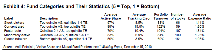 有用的统计数据的第二个特点是有效性,它引导你到你寻求的结果。研究表明,如果是选股的结果,高主动投资比率是可取的;但如果是风险因子押注而出现的高跟踪误差,则不太可取。佩塔吉斯托根据1990年至2009年的结果将1124只基金分为五类(见图表4)。主动选股的投资者处于主动投资比率最高的五分之一,但是在跟踪误差较低的后80%之中。他把有最高主动投资比率和跟踪误差的一类标记为“集中型”。这些基金具有很高的系统性因子风险。主动选股型基金的主动投资比率是97%,平均跟踪误差为8.5%。集中型基金的主动投资比率相似,为98%,但跟踪误差为15.8%,几乎是选股者的两倍。