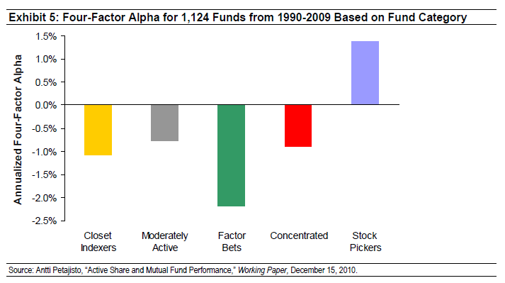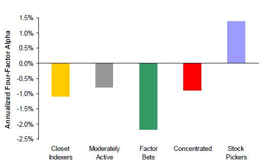 佩塔吉斯托确实发现,低主动投资比率的股票基金往往具有较低的费用率,但费用率低也难以使业绩表现变得突出。产生超额回报已经足够困难了,但以低的主动投资比率和平均费用率使任务变得更加艰巨。