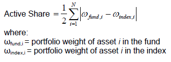 现在让我们仔细看看主动投资比率。用简单的话说,主动投资比率是”基金投资组合中与基金基准指数不同的百分比”。假设没有杠杆或卖空,如果基金完全模仿指数,主动份额为0%,如果基金与指数完全不同,则主动投资比率为100%。