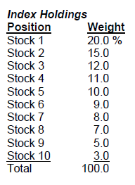 下面有个简单例子。假如指数有10个股票,权重如下: