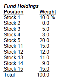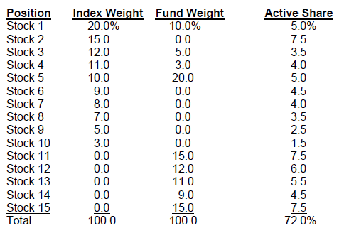 在这个简单的示例中可以看到,主动投资比率是指数中不持有或权重不同的股票(见股票1-10)和持有不在指数中的股票(参见股票11-15)的结果。