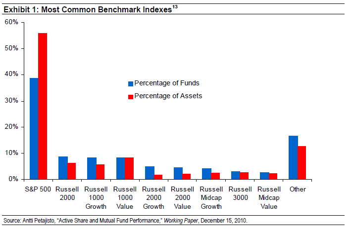 选择指数作为基准显然至关重要。安蒂·佩塔吉斯托的研究表明,在他分析的大约2500只共同基金中,38.6%以标准普尔500指数为基准。按资产规模,56%的基金以标普500指数为基准。其他受欢迎的基准包括罗素2000指数(8.8%按数量,6.2%按资产规模)、罗素1000成长指数(8.4%按数量、5.6%按资产规模)和罗素1000价值指数(8.2%按数量,8.4%按资产规模)。下图表1显示最常见的基准索引。