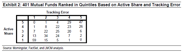 图表2列了一个矩阵,该矩阵根据2007年底的数据,根据主动投资比率和跟踪误差对401只共同基金进行分类。根据每个衡量标准,这些基金被分为五分位,其中1为最低值,5为最高值。这些单元格代表每个五分位数对的交叉点的资金数量。例如,右上角看到47只基金(占样本的11.6%)是处于主动投资比率和跟踪误差都最高的五分之一。这些基金与基准大不相同,其业绩与基准差异很大。相比之下,左下角显示的59只基金的样本,即近15%的基金处于主动投资比率和跟踪误差最低的五分之一。这些是指数对接基金。要跻身前五分之一,基金必须持有高于91%的主动投资比率和高于5.3%的跟踪误差。