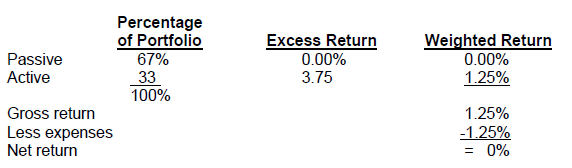 这就是为什么很难以低的主动投资比率和平均费用率击败市场的原因。假设一只基金的费用率为125个基点(在佩塔吉斯托的研究里大致是所有基金费用率平均值),主动投资比率为33%。这意味着三分之二的投资组合获得与基准指数相同的回报。因此,主动部分必须用大规模表现的差异来弥补。例如,为了等于基准的回报,主动投资部分需要获得375个基点的超额回报: