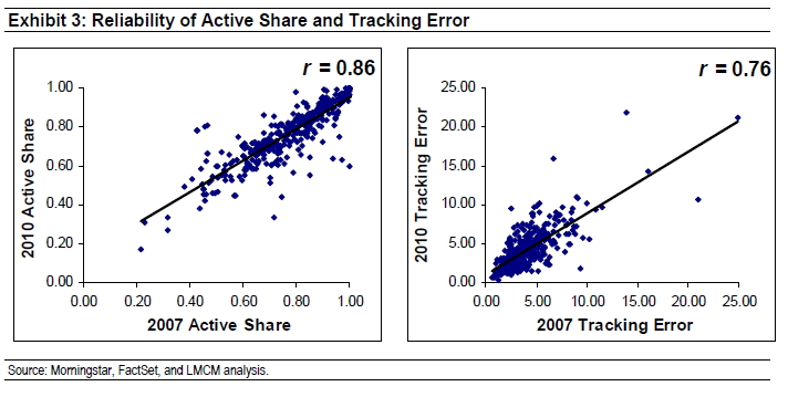 我们之前注意到,基于回报的基金经理技能评估方法跳过了可靠性和有效性的步骤。现在我们将有用的统计数据的功能应用于主动投资比率和跟踪误差。在这种情况下,测试可靠性的方法是检查同一基金在两个不同时间段内的主动投资比率之间的相关系数。以约400只共同基金的样本计算,2007年和2010年活跃份额之间的r占86%(见图表3左侧)。克雷默斯和佩塔吉斯托也发现主动投资比率是可靠的。这是有道理的,因为主动投资比率在基金经理的控制范围内。