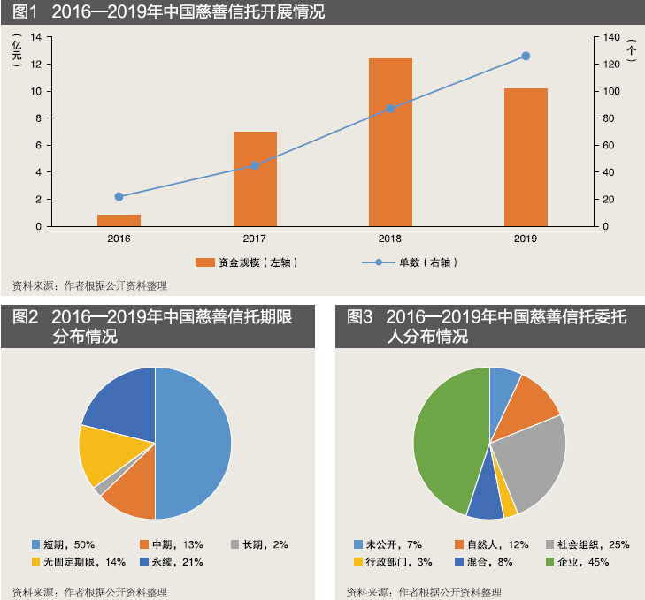 根据《慈善信托管理办法》的定义,慈善信托属于公益信托范畴,基于慈善目的,委托人将其合法持有的财产委托给受托人,受托人按照委托人意愿以自身的名义对信托财产进行管理和处分,开展慈善活动,从事慈善项目执行的行为。随着2016年9月《中华人民共和国慈善法》以及2017年7月《慈善信托管理办法》的实施,国内慈善信托业务发展进入爬升期。根据信托业协会统计的数据,截至2020年6月末,国内新设立慈善信托140单,规模达到2.4亿元,累计设立慈善信托420单,总规模达到32.58亿元(见图1)。根据2019年慈善信托备案情况可以看出,近几年国内慈善信托具有以下发展趋势。第一,从期限来看,慈善信托还是以短期为主,虽然中长期、永续型慈善信托所占份额有所提高,但是5年以下的慈善信托占比将近50%,10年以上中、长期慈善信托的合计占比15%(见图2)。第二,从委托人分布来看,企业仍是慈善需求的主力,委托人中有45%的比例都是企业,同时,自然人委托人的数量也在大幅增长,更多的自然人开始投入到社会公益慈善领域(见图3)。