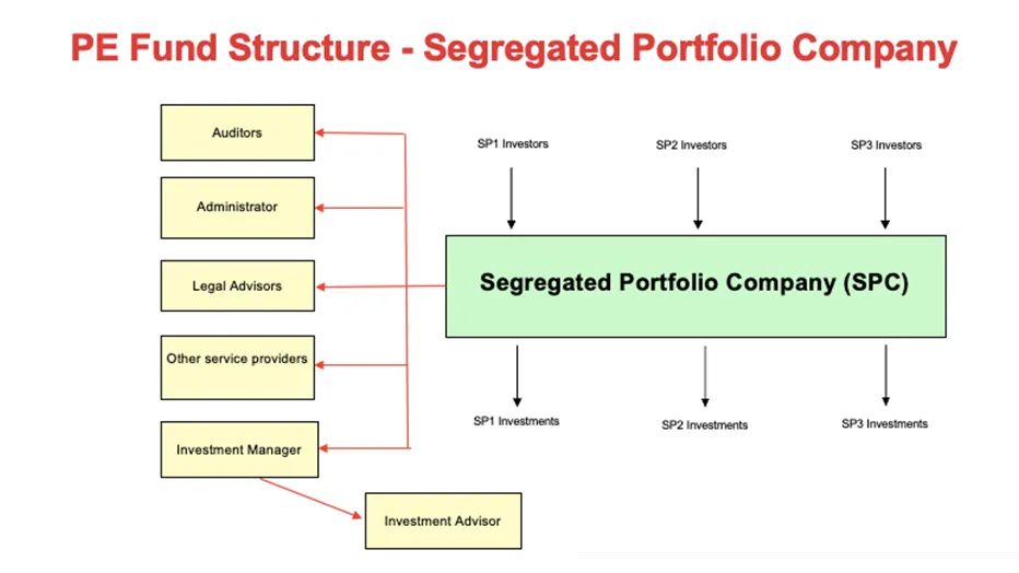 SPC是开曼法项下的Exempted Company(受豁免公司)。其结构为:一个SPC下面控制多个SP,每个SP均不是法律实体,而是相互独立的投资组合。通常情况下,每个SP下面投一个项目,其便捷之处在于:同一个管理团队下设的各SP可以由不同的投资者投资不同的项目。