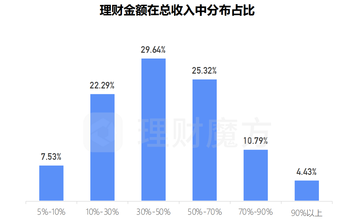 从金融产品配置投入金额占据总收入比重来看,理财魔方调查数据显示,近30%的受访者愿意拿出总收入的30%-50%去购买股票和混合基金等权益类资产,占比最集中,25.32%的受访者愿意拿出总收入的50%~70%用于理财投资,超20%的受访者愿意拿出10%~30%的资金去投资各类金融产品。