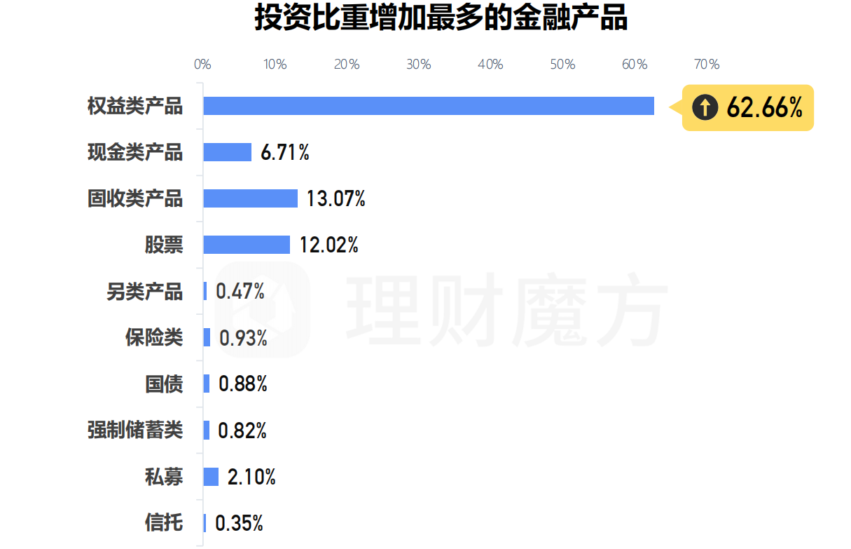 - 从增加金融产品配置比重来看,理财魔方调查发现,权益类产品配置增加超六成,居民财富正加速向资本市场转移。