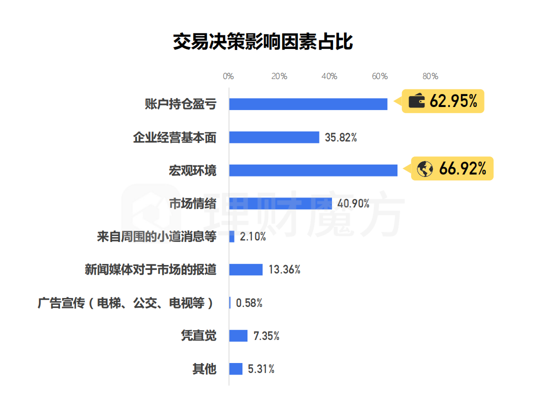一千个人心中有一千个哈姆雷特,同样每个投资者都有着自己的选股选基方法和交易决策逻辑,而且影响因素多样。理财魔方调查数据显示,宏观环境是影响受访者投资决策最主要的因素,占比为66.92%。62.95%的受访者做投资决定会被自身账户持仓盈亏影响,40.9%的受访者则会被市场情绪引导。可见,投资者更容易被决定大方向的宏观环境影响。