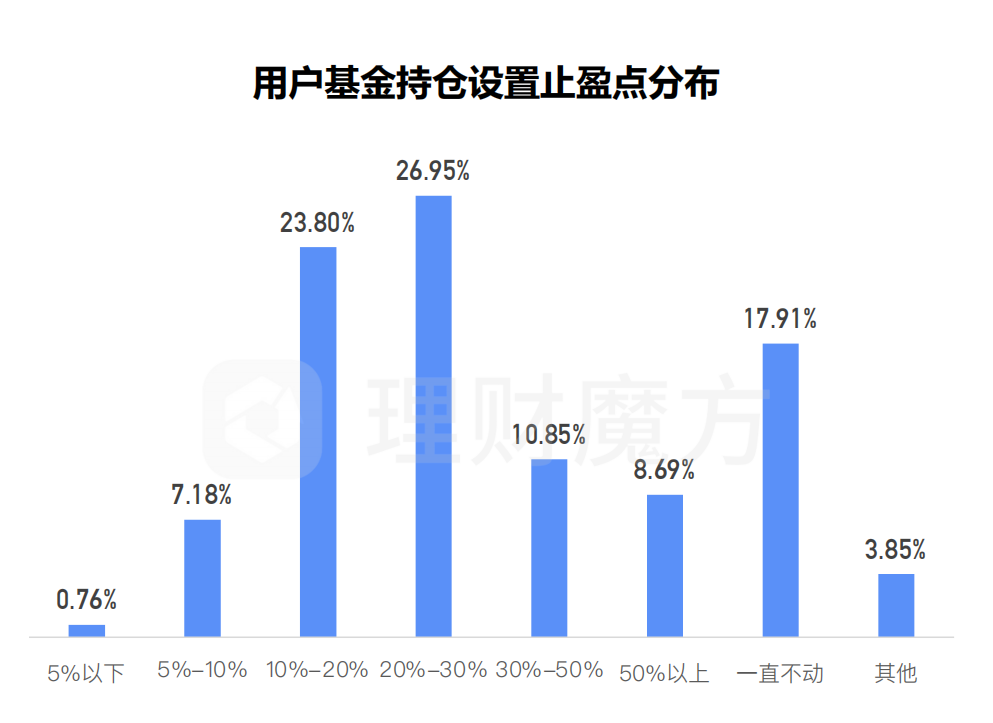 “会买的是徒弟,会卖的是师傅。”基金止盈点的设置考验着每个投资者对自身风险承受能力的认识。理财魔方调查数据显示,26.95%的受访者在基金持仓浮盈20%~30%时会设置止盈点,占比最为集中。另外,23.8%的受访者在基金持仓浮盈10%~20%时设置止盈点,还有17.91%的受访者会把持仓基金一直放着不动,长期持有。
