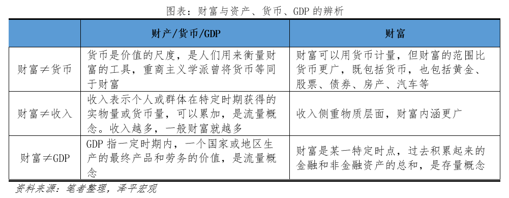 在高度发达的金融体系下,财富不等同于货币、收入或GDP等概念,财富形式更加多元。按照资产是否具有实物形态,可以将财富划分为金融资产和实物资产。金融资产主要包括通货及存款、居民理财、股票、债券、基金、信托、保险、黄金等;实物资产以不动产为主。金融资产和不动产一般是影响居民财富变动的主要因素。