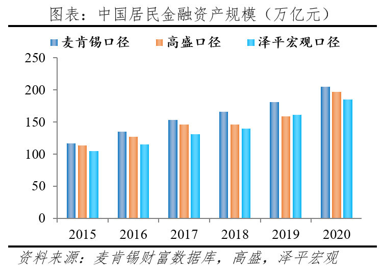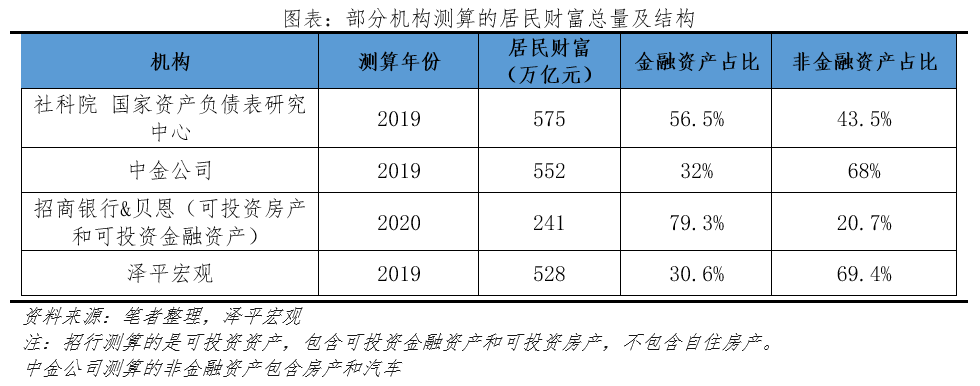 市面上有部分机构对居民财富总量、结构进行测算,主要有社科院国家资产负债表研究中心、中金和招商银行。招商银行联合贝恩公司,借助洛伦兹曲线估算居民财富总量,2020年可投资房产和可投资金融资产的规模总计达241万亿元。2019年,社科院、中金公司和泽平宏观测算的中国居民财富总量分别为575、552和528万亿元,在总量数据上相差不大。关于金融资产和实物资产的占比,我们跟中金测算的结构接近,2019年金融资产占比近三成,非金融资产占比近七成。