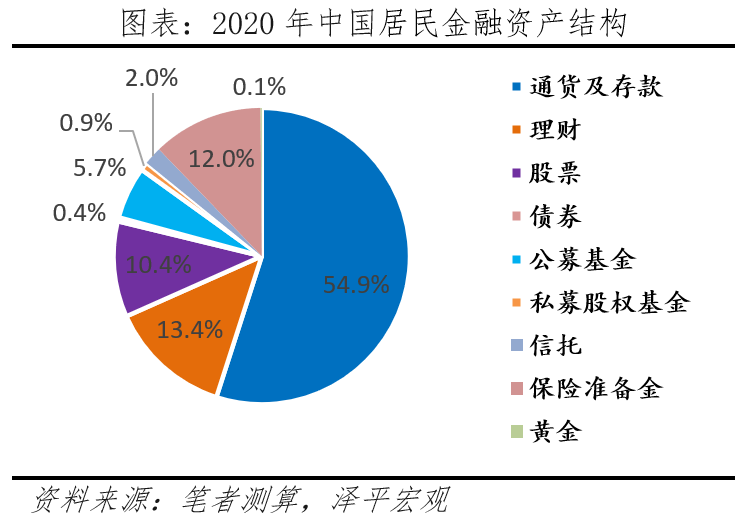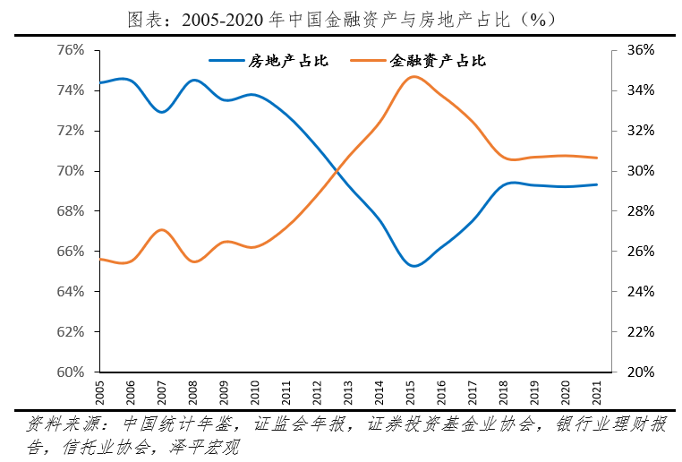 2)结构层面,金融资产占比较低,实物资产占近七成。2021年中国实物资产占总财富比重高达69.3%,主要表现为房地产,全国住房市值达到476万亿元;金融资产占比30.7%,随着金融创新深化和直接融资比重提升,2005-2021年居民持有的金融资产占比上升了5个百分点,但仍偏低,相比之下2020年全球、北美、西欧、亚洲(不含日本)的金融资产在总资产中占比分别为48%、28%、55%和64%。