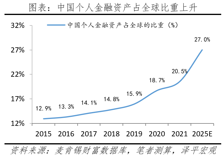 中国金融资产在全球金融资产占比超二成。当前麦肯锡、高盛等多家机构对中国居民金融资产规模进行了测算。根据我们测算,2005-2021年,金融资产总量从20万亿元上升至211万亿元,在居民财富总量中占比从26%上升至31%,2021年在全球金融资产的占比突破20%。