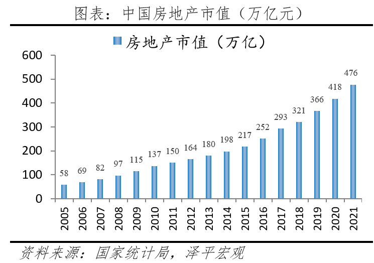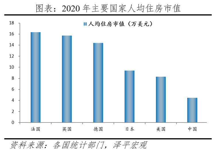 住房资产方面,2021年住房市值已突破476万亿,但人均住房市值低。中国人口长期大量向一二线核心城市集聚,但是人地严重错配,一二线城市土地供给严重不足导致高房价,三四线城市土地供给较多导致高库存,进而导致全国住房市值较高。与国际相比,2020年中国住房市值为62.6万亿美元,明显大于美国的33.6万亿美元、日本的10.8万亿美元、英法德三国合计的31.5万亿美元。从人均住房市值来看,2020年中国为4.48万美元,远低于美国、日本、英国、法国、德国的8.3、9.4、15.7、16.4 、14.4万美元。