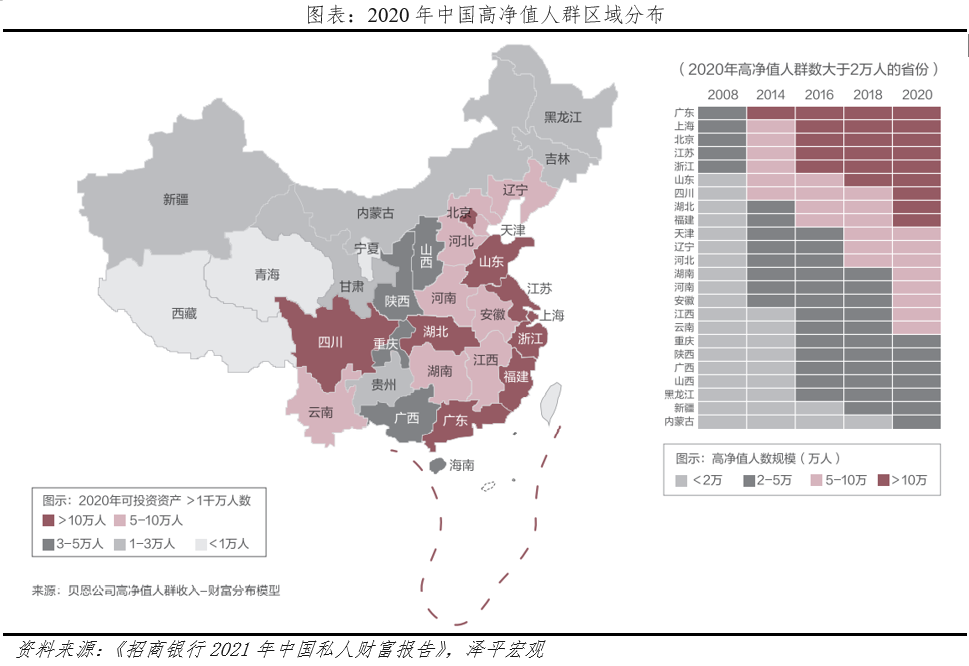 分地区来看,“地区富”则“居民富”。家庭资产分配的分布规律与地区GDP分布较为相似。根据《招商银行2021年中国私人财富报告》测算的高净值人群区域分布,2020年广东、上海、北京、江苏和浙江五个东部沿海省市的高净值人群人数占全国总数的44%,山东、四川、湖北、福建紧随其后,这些区域经济发展水平较高,高净值人群分布密度高。
