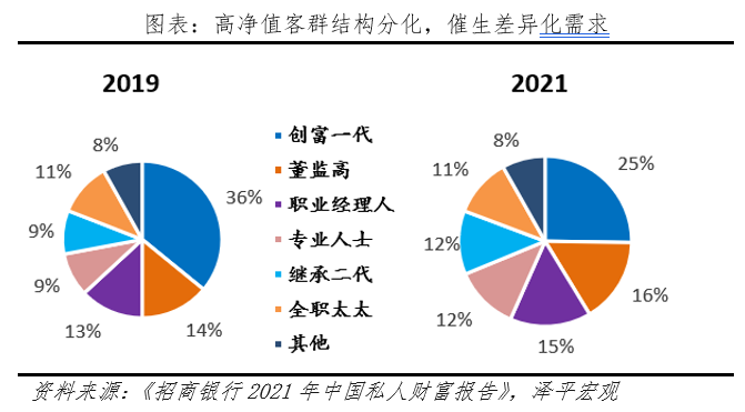 分需求偏好来看,高净值客群偏好“私人定制”。多元化的高净值客群结构催生了差异化的财富管理需求,高净值客户越来越关注“私人定制”。由于部分继承二代对父辈从事行业不感兴趣,如何实现未来公司治理和家族财富传承成为传统创富一代的核心诉求,而新兴行业诞生的高净值人群更关注财富创造。加之职业金领、继承二代等人群规模占比提升,标准化理财方案已经难以满足多元化客群的财富需求。