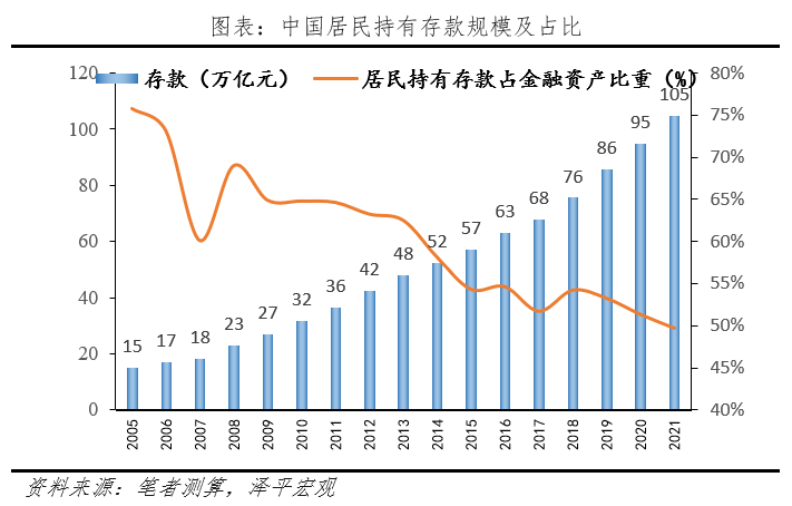 从产品特征看,偏向固收类资产,收益率低,抗通胀能力不足。改革开放以来,中国基本处于货币超发状态。1985-2020年中国广义货币供应量M2上涨近420倍,年均增速约15%,同期实际GDP平均增速仅为9.2%。当前受国际局势、大宗商品价格波动等影响,国内通胀压力难以忽视。纵观中国居民资产配置结构,尽管居民持有存款占金融资产的比重呈下降趋势,从2005年75.8%逐步降至2021年49.7%,但占比仍偏高。根据数字100研究院调研,有72%的受访者仍然表示首选存款,“储蓄为王”的意识仍然深入人心。