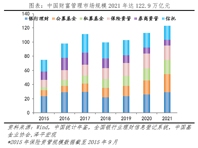 从市场规模看,中国资管规模全球第二,对亚洲的贡献超八成。中国财富管理行业整体规模从2015年74.8万亿元逐步上升至2021年122.9万亿元,年化增速达8.6%。美国是全球第一大资管市场,2020年资管规模为45万亿美元,占全球市场的43.6%。中国资产规模仅次于美国,2020年中国资管规模在全球占比为19%,在亚洲占比超八成。资管新规实施以来,打破刚兑,产品净值化转型,压降通道类业务,财富管理机构表现分化。2021年银行理财、信托和券商资管的规模较2017年分别下降1.8%、24.4%和51.4%。保险资管、私募基金和公募基金发展迅速,2021年的规模较2017年上升30.8%、76.5%和120.7%。