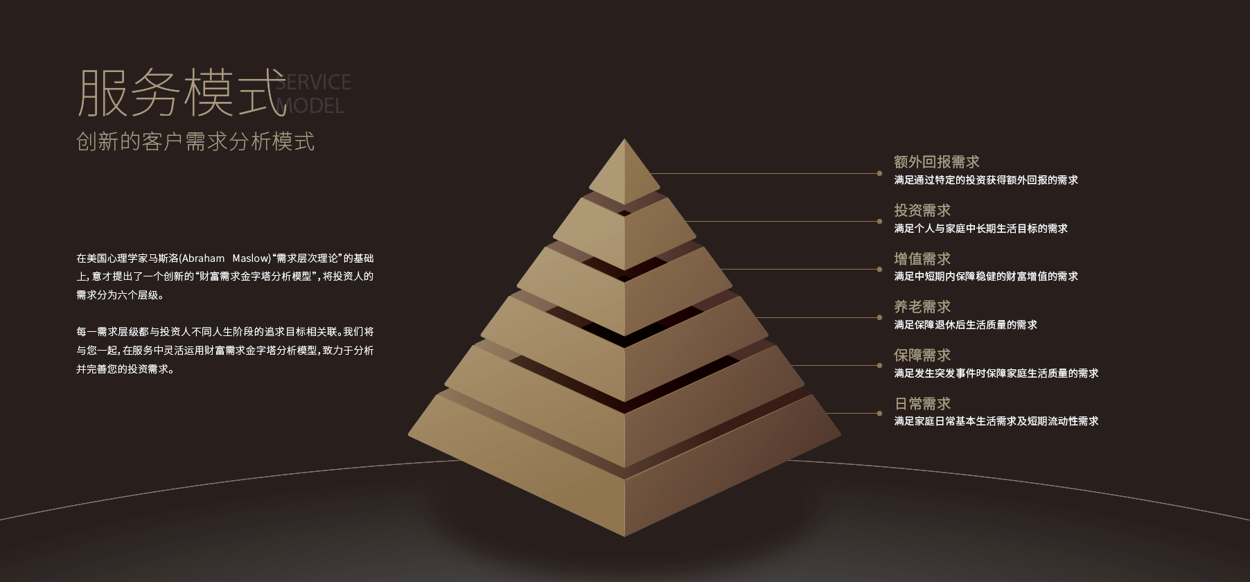 自驶入中国财富管理市场这条赛道伊始,意才便下定决心为中国财富管理市场的发展贡献一份力量。为了做到这一点,意才通过创新的“财富需求金字塔分析模型”,认真分析客户的实际需要,以完全透明和依法依规的方式,协助客户更有效地管理自己的资产。