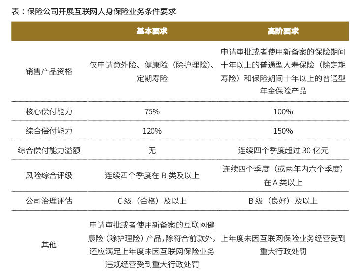 同时,108号文第(十一)项条款对于保险公司申请审批或者使用新备案的互联网意外险、定期寿险产品;申请审批或者使用新备案的互联网健康险(除护理险)产品;申请审批或者使用新备案的保险期间十年以上的普通型人寿保险(除定期寿险)和保险期间十年以上的普通型年金保险产品所须符合的条件,分别作了明确(见表)。值得一提的是,该项条款被业内喻为监管部门就险企申请开展互联网人身保险业务相关条件制定的“基本要求”和“高阶要求”。
