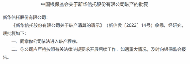 7月6日,银保监会发布公告,同意新华信托进入破产程序,这是过去20多年来首家破产的信托公司,对整个行业发展具有极强的象征性意义。新华信托破产,可能会让信托行业的兑付危机进一步浮出水面。对于那些追求信托高收益的投资者而言,需要做好信托产品爆雷继续升级的心理准备。