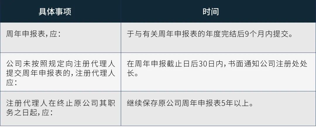 若公司未能按照规定向注册代理人提交周年申报表,则注册代理人有义务在周年申报截止日后三十天内,书面通知注册处处长,告知其违规的公司名称、未提交周年申报表的年份及该公司最后一次提交周年申报表的时间。
