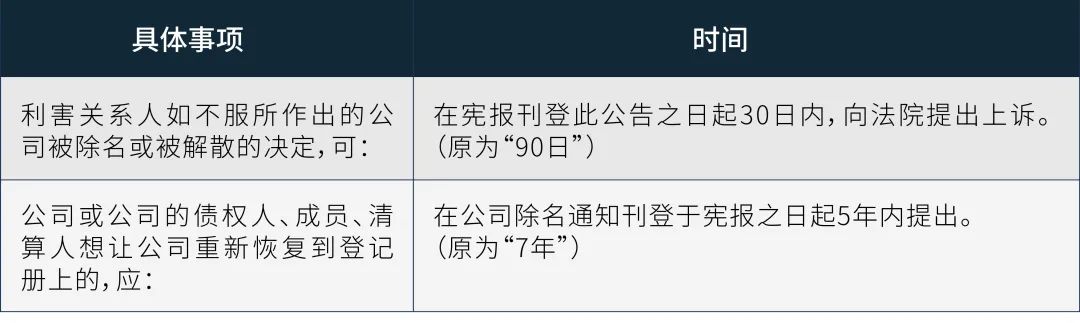修正案规定,自2023年1月1日起,如果公司根据修订案213条第4款的规定被除名,则该公司将于注册处处长在宪报上公布注销通知之日起解散。这改变了以往公司法第216条关于公司解散的规定:“凡根据本法第213条被除名的公司,如果该司连续7年处于被除名状态,则自7年期间的最后一天起该司解散。”