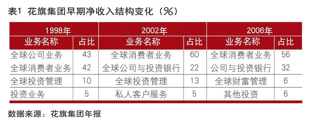 1998年,花旗集团由花旗银行与旅行者集团合并组建而成,建设起四大业务板块,分别是全球消费者业务、全球公司业务、全球投资管理业务和投资业务。其中,全球消费者业务对集团净收入的贡献率达到42%,与公司业务并驾齐驱。