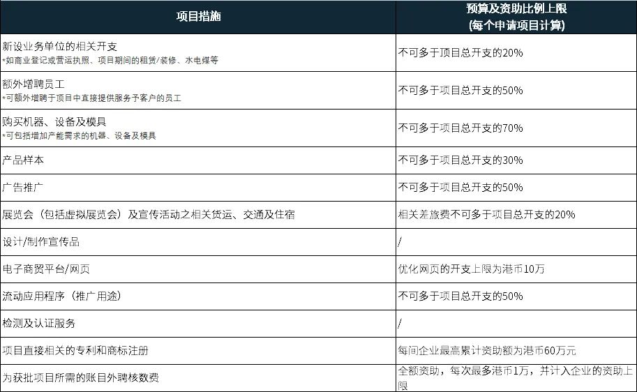 香港政府最高资助累计资助上限为700万港元,最多占项目实际成本一半的资助,以1:1配对模式向企业提供资助。最多可获批50个项目,项目完成期少于24个月。资助范围如下: