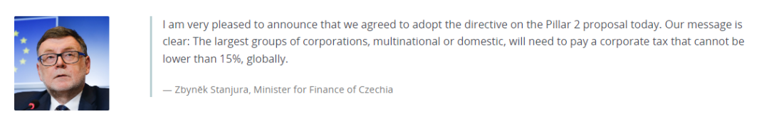 担任欧盟理事会轮值主席国的捷克共和国财政部长 Zbyněk Stanjura 对该协议表示欢迎,认为这是向企业发出的关于税收的明确而有力的信息。
