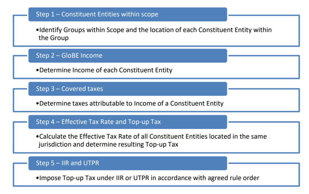 为了更好的帮助企业完成政策过度,实现在合乎法规的情况下,落实全球最低税要求,OECD在公布的指南中提出公司在计算税款时必遵循的“五步法”。从“范围界定”步骤开始,即根据一套复杂的规则(同时涉及很多例外情况),确定包括哪些集团实体,确定每个国家/地区的有效税率,进而确定可能面临的任何追加税的金额,最后确定应缴纳此类税款的司法管辖区。