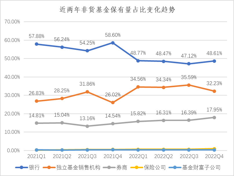 其实,每个季度公布一次的基金代销保有量排行榜,本身也受到短期市场因素扰动的影响。比如,对于主要面对较低风险偏好客群的机构,四季度的债市大跌肯定会造成更大冲击。一个季度排名的升降,也并不意味着财富管理机构的能力就发生了重大变化。债基赎回导致非货保有量下降了,但客户如果能找到其他契合其需求的产品,并不意味着客户的流失。