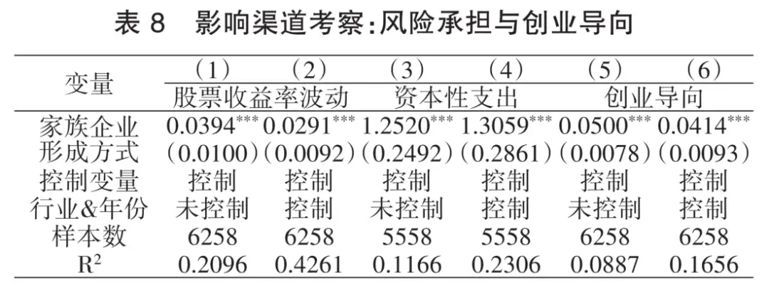 “上述检验结果充分表明,相比于改制家族企业,创业家族企业更偏好于风险,具有更强的创业导向和风险承担能力。而已有研究表明企业的风险承担能力和风险偏好促进了对外直接投资[30]。因此,风险偏好的差异在家族企业形成方式与对外直接投资的因果关系中起到了渠道作用。”