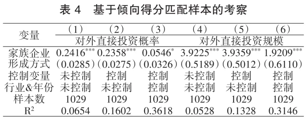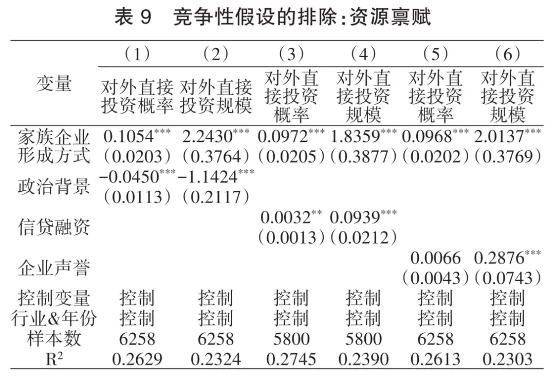 “综上所述,在控制两类家族企业的资源禀赋差异后,本文因果关系仍成立,说明形成方式对家族企业对外直接投资的影响在排除竞争性假设后保持不变。”