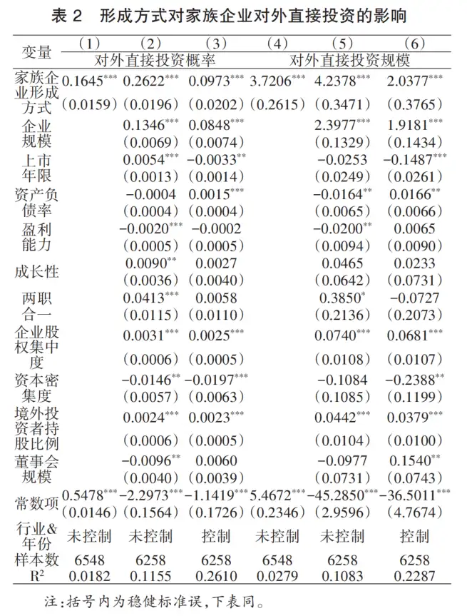 本文通过实证检验发现,形成方式对家族企业对外直接投资存在影响,创业家族企业相较于改制家族企业更倾向于进行对外直接投资,本文提供的解释是相比于国内投资,企业进行对外直接投资面临的环境更加复杂,对企业的风险偏好意愿提出了更高的要求。