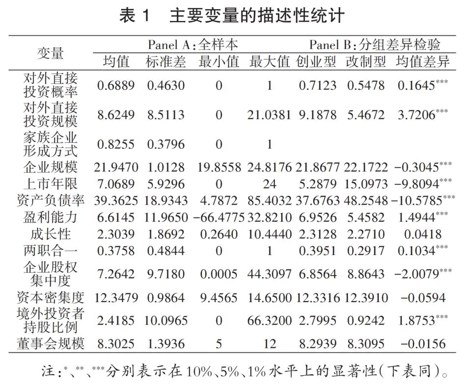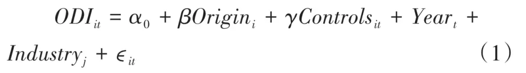 此外,为尽可能控制行业特征和时期因素对家族企业对外直接投资的影响,本文纳入行业Industry和年份Year的哑变量。计量模型(1)之所以无法控制企业个体固定效应,原因在于核心解释变量家族企业形成方式Origin基本不随时间变化,是企业的固有特征之一。