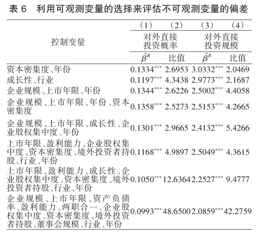 本文使用了8组不同受限程度的控制变量组合。表6列(1)和列(3)分别报告了使用对外直接投资意愿和投资规模作为因变量进行受限控制变量回归时的形成方式系数。列(2)和列(4)分别报告了相应的差值比。