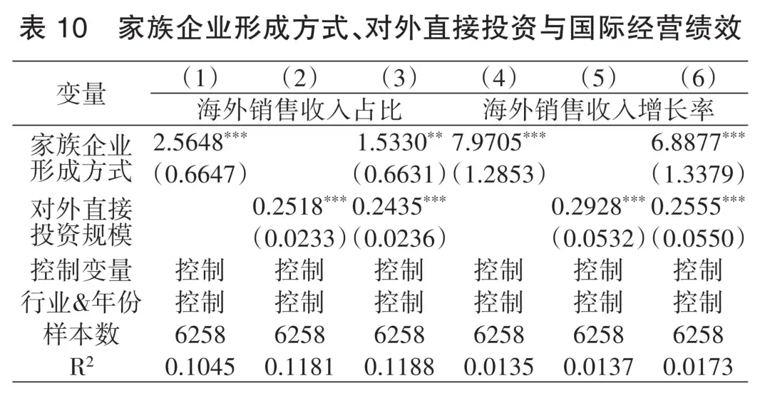 在验证了形成方式对家族企业对外直接投资的影响之后,本文探索该影响产生的进一步后果,有助于理解家族企业表现差异的历史原因。对这一问题的考察也便于形成明确的价值判断,提供明晰的政策建议。为此,本文分析形成方式对家族企业对外直接投资的影响如何进一步作用于企业国际经营绩效,相关回归结果如表10所示。