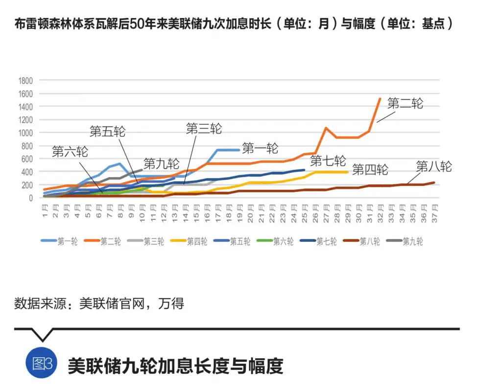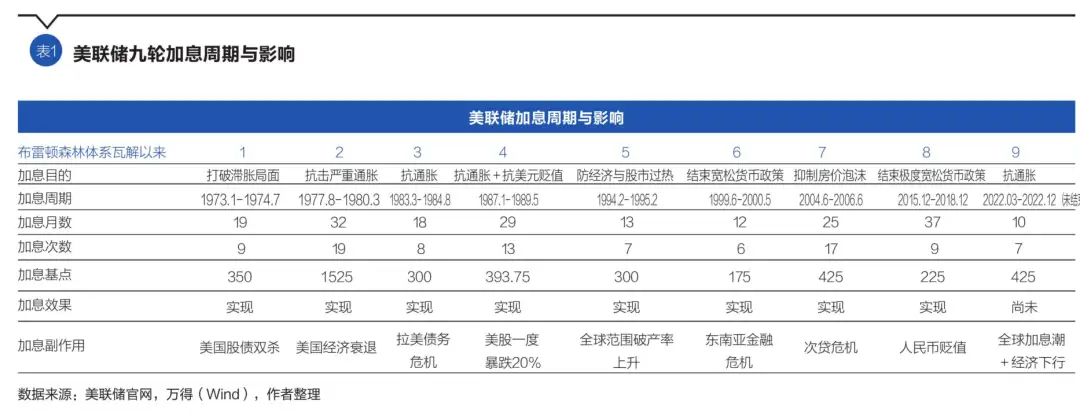 “自20世纪70年代初,布雷顿森林体系瓦解以来,美联储已导演了九轮加息,最新一轮目前仍在进行中。加息目的是为了解决美国自身的经济金融问题,不过由于美联储加息牵涉面广,往往也会给美国本土,以及全球经济金融带来负面影响与冲击。此外,在这九轮加息周期中,第一轮到第四轮中途也存在降息的情况。”