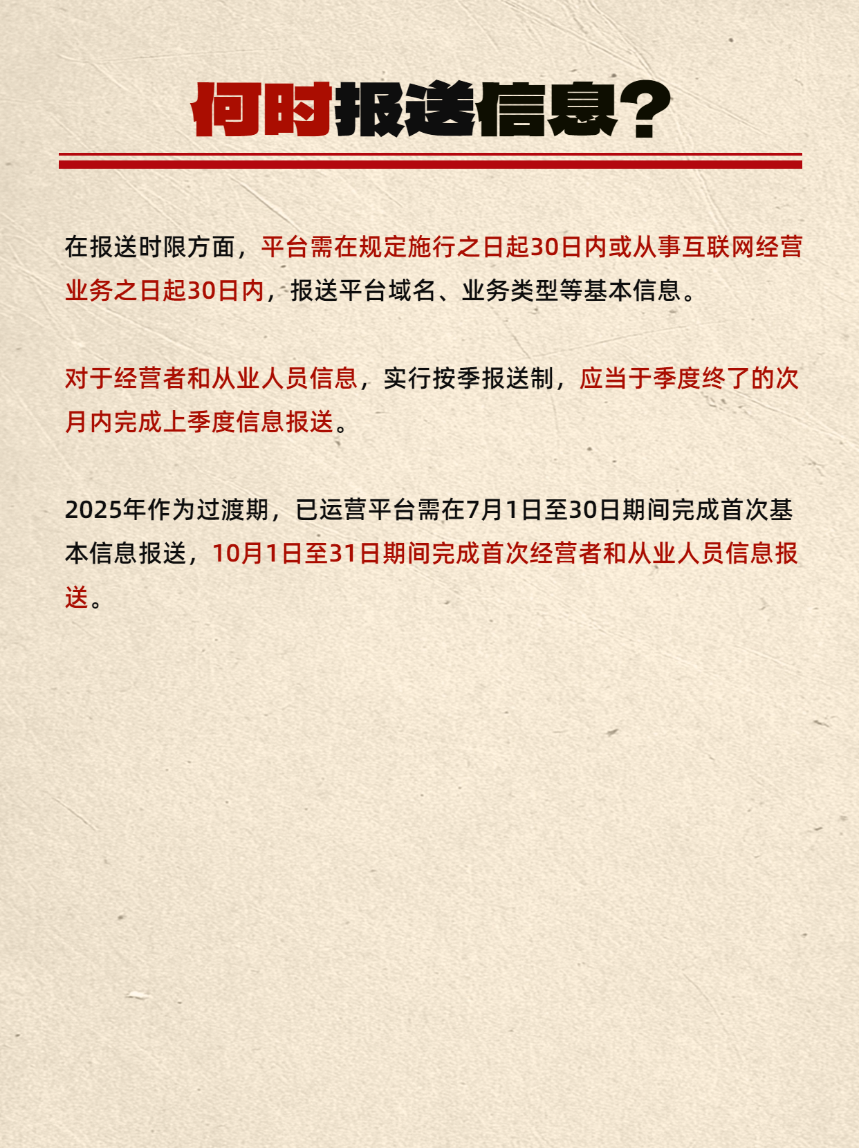 包括淘宝、京东、美团、字节跳动、小红书等已运营平台需在7月1日至30日期间完成首次基本信息报送,10月1日至31日期间完成首次经营者和从业人员信息报送。