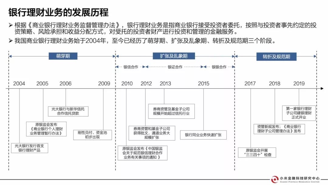 我国商业银行理财业务始于2004年,先后经历了萌芽期、扩张及乱象期、转折及规范期三个阶段。《商业银行理财子公司管理办法》的颁布,代表着银行理财业务进入了新的发展时期。